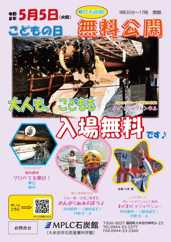 MPLC石炭館では毎年、5月5日のこどもの日に無料公開しています。 当日は家族で楽しめるイベントを用意しています。