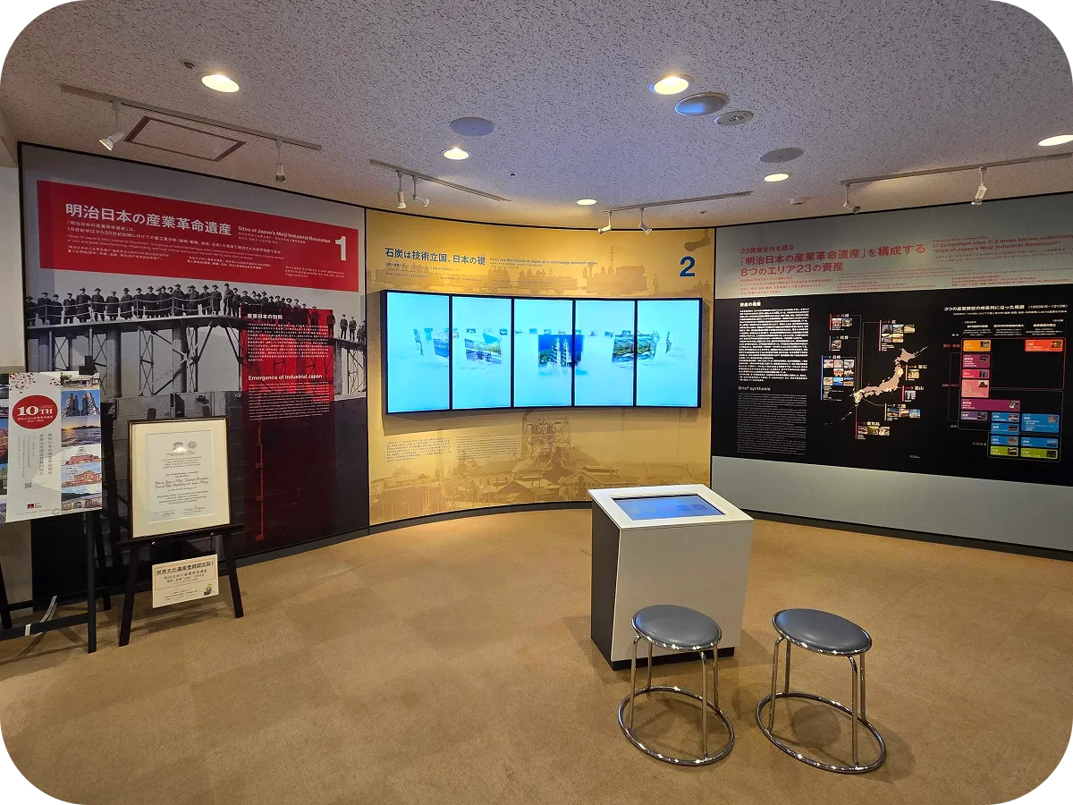 2015年に世界文化遺産に登録された『明治日本の産業革命遺産 製鉄・製鋼、造船、石炭産業』の インフォメーションコーナーです。『明治日本の産業革命遺産 製鉄・製鋼、造船、石炭産業』は、 三池炭鉱関連施設を含め、九州山口を中心に8県 11市にまたがる8エリア23の資産で構成されています。 パネルや映像などで『明治日本の産業革命遺産  製鉄・製鋼、造船、石炭産業』の構成資産を紹介しています。